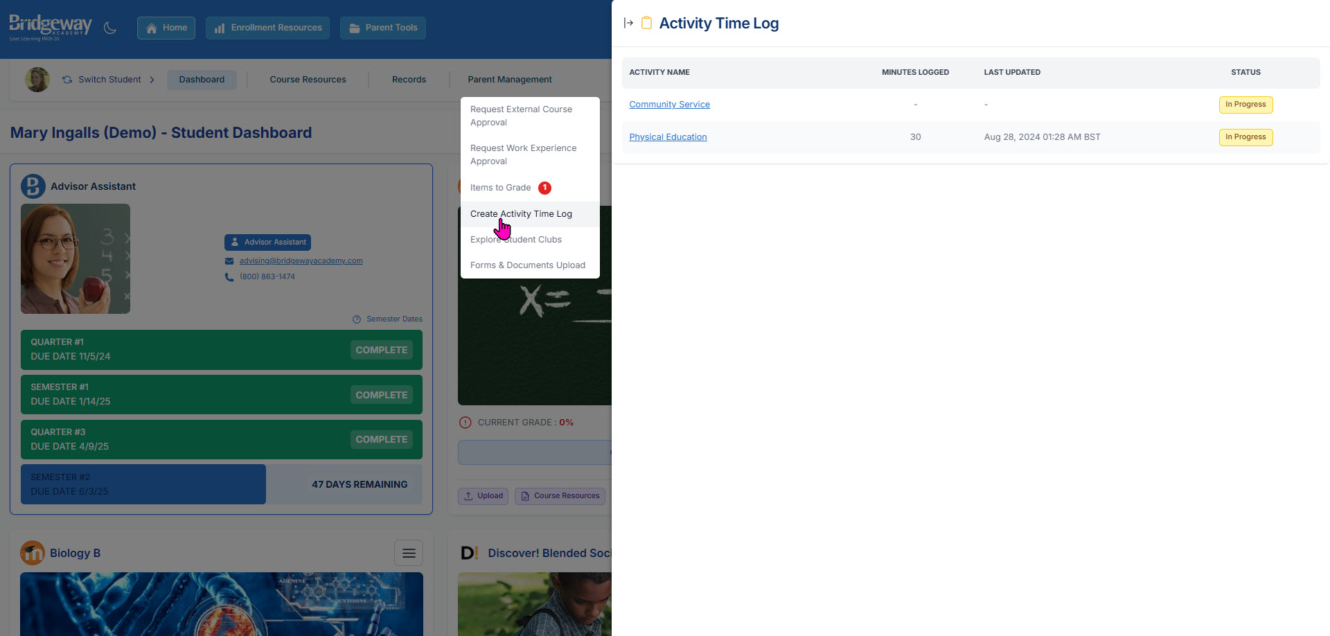 The physical development in your child’s education is one of the easiest areas to overlook. A physical education program needs to be implemented within each homeschool. Bridgeway Academy has established a minimum physical education concept; yours may exceed this minimum. Students should have 30 to 45 minutes of vigorous exercise at least 3 times each week. Aerobics include jogging, brisk walking, and other activities that increase the heart and breathing rate. The purpose of this type of exercise is to cleanse the circulatory system while promoting good health and mental alertness. Aerobics can be connected to coordination and dexterity activities. This can be especially beneficial for children up to the 7th or 8th-grade levels. At the high school level, each student must earn 1 credit of Physical Education. Credit for physical education is awarded based on the parent/teacher verifying that the high school student has diligently followed the family’s PE program. Students must log 60 hours of PE to earn .50 credit. If a student logs 120 hours of credit in one academic year, 1.0 credit will be issued. A total of 1 full credit of PE is required for graduation from Bridgeway Academy. A student cannot be awarded more than two (1) PE credits in a single academic year. It is recommended that all students complete PE for each year enrolled with Bridgeway Academy. In order to earn credit for Physical Education, the Physical Education Log must be kept. Recording and Submitting PE LogsYou can download the PE log under the Forms and Documents page under Enrollment Resources on your Parent BLC dashboard. It is preferred that you use the Activity Log built into the Bridgeway Learning Center.To add time to a log, navigate to your student dashboard in your Parent Bridgeway Learning Center account and click on the PE course. You can also access the log by selecting Add Activity Log under the Parent Management tab from the student dashboard.To add time to the log, select the Add Time button. The Add Time Logged form is displayed.Enter the time in minutes, description of the activity, and if you want, select the Marking Period when this activity was completed. Then click Save. If you need to edit an entry, select the edit (pencil) icon under the Action column.