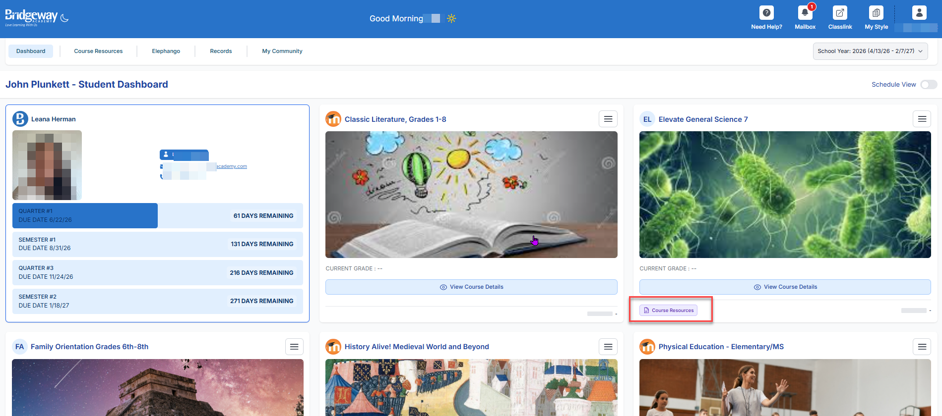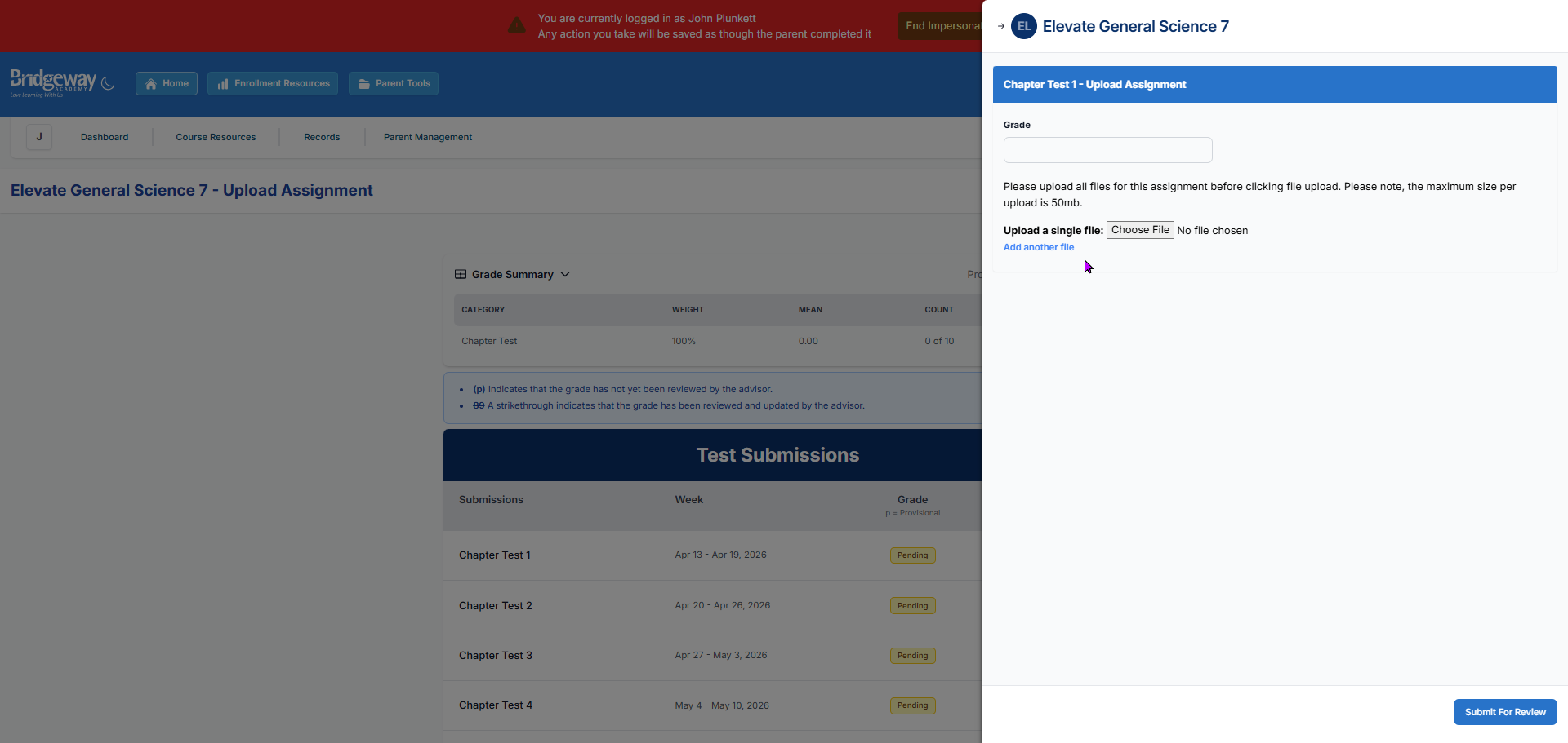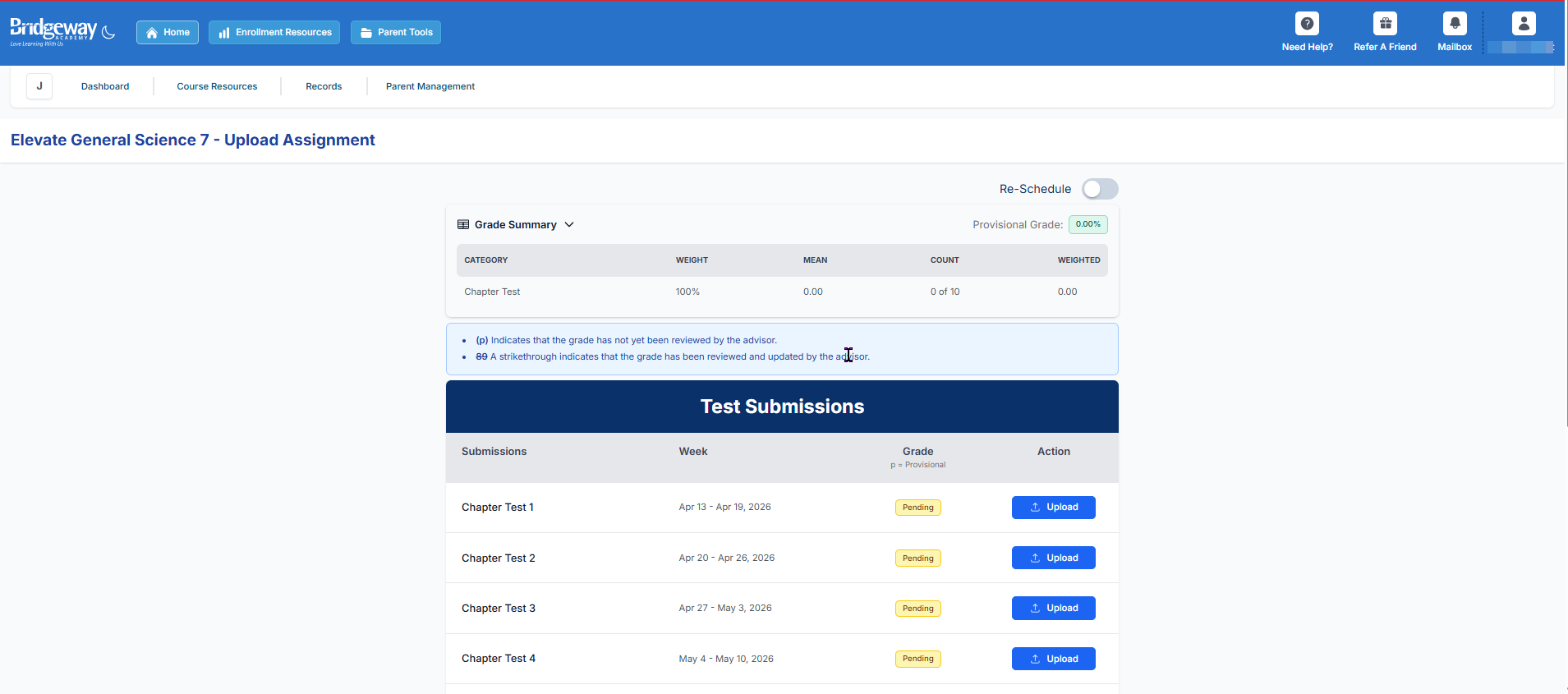 Textbook CoursesWe offer textbook courses for students from Pre-K through twelfth grade. These textbook options come in a variety of publishers and formats, meaning we have something for everyone. If enrolled in a Textbook course, you receive your curriculum directly from Bridgeway Academy with all the items you need for a successful school year. Additional materials for your student’s courses can be viewed by selecting Course Resources from the course card in the Bridgeway Learning Center. Other than Course Resources, there is no online content or online tests available for textbook courses.Clicking on Course Resources will display if there are available resources for this course. Both parents and students will see this option. If there are parent-only resources available, they will be displayed in the Parent login.Your student can view these by logging in to their Bridgeway Learning Center account and clicking on the course title. Once in the course, it is important to review the resources available, including the Instructor Guide. This guide will help you stay on track for the school year, as well as provide additional activities you can try with your student. Uploading Grades and Assignments for Textbook CoursesParents are able to upload assignments and enter grades for required assignments from the parent login in the Bridgeway Learning Center.Select the Submission to upload. Enter the grade you gave the assignment.Browse your computer for a digital file for this assignment. This can be the a pdf, image, .docx, png, jpeg, etc.Submit for review.The submitted assignment will show as Pending until reviewed and accepted by your advisor.Parents are responsible for the following:Presenting the course material to your student.Reviewing and grading completed coursework, including writing assignments, lab experiments, workbook questions, and paper-based quizzes and tests.Scanning and uploading any paper-based quizzes and tests, as well as any required writing assignments, to their specific course from the Parent Login in the BLC.Notifying your advisor if you find a testing error has occurred.Reaching out to your advisor if you find you are struggling to present a concept, find the curriculum is not the right fit, or just need guidance throughout the school year.Advisors are responsible for the following:Providing guidance, support, and encouragement throughout the school year.Reviewing and grading completed online tests for accuracy.Providing grading assistance for writing assignments.Reviewing submitted materials at the end of each semester and providing feedback on your student’s progress.Checking in with your family and student on a quarterly basis. More frequent check-ins are provided upon request to meet your individual family’s needs. Since each curriculum has its own unique layout and requirements, be sure to speak with your advisor about the expectations for the curriculum your student is using.