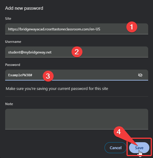 Some international students might not be able to use the Classlink browser extension to automatically sign them into Classlink apps. This is because more governments are changing their laws regarding censorship and children online. You can still create an automatic login with your browser settings. to sign them into Classlink apps automaticallyIn this example, we are using Google Chrome with the Rosetta Stone URL: https://bridgewayacad.rosettastoneclassroom.com/1. In Chrome, click on the 3 dots in the top right corner to open the Menu. Then click the option for Passwords and Autofill, then Google Password Manager.2. This will open up a new tab with a list of your already saved passwords you use for both Bridgeway and personal use. Click on the Add button.3. A small window will appear. Paste the Rosetta Stone URL from above into the Site box. Then enter your student username (@mybridgeway.net) in the Username box. Next, enter in the password for Rosetta Stone (this is different than your student password. Please reach out to Tech Support if you do not have this unique password). Finally, press the Save button. 4. Once on the login page, your username and password will autofill. Please note, sometimes you will need to click on the Username box, and then your saved info will appear as a clickable option, and then it will autofill.