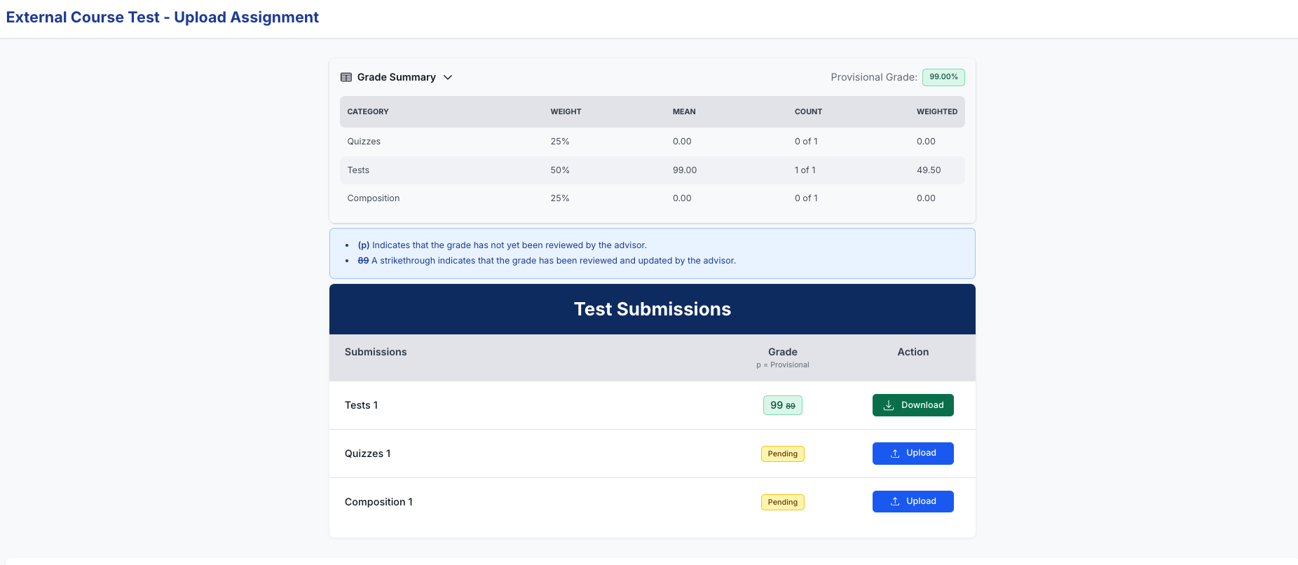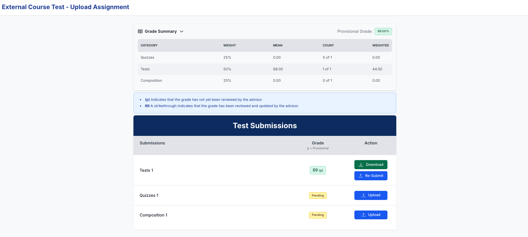 Bridgeway Learning Center - Textbook and Accreditation Course GradingParents can click the Upload Assignments button on any external course card to add grades and work uploads to the assignments specified when the course was requested (see this documentation for further detail on the request process). The Upload button is for additional uploads related to the course which may be requested by your Advisor and are NOT related to graded work.After clicking Upload Assignments, you will reach a page where you can see 1) previously uploaded work, 2) previously assigned grades, and 3) grade and upload new work. Clicking Upload next to any assignment will allow you to enter a numerical grade and upload its corresponding work sample for review.After you have submitted a grade for an assignment, the page will update to include that grade and allow you to 1) Download the submitted work sample for review and 2) Re-Submit the work. You can resubmit the work as many times as necessary before your Advisor reviews the assignment. The (p) next to the grade indicates that the grade is provisionally assigned and may be updated by your Advisor. When your Advisor has accepted the grade, the (p) will disappear. If your Advisor modifies the grade you provided, your original grade will remain but will appear as struck-through, and the assigned grade will appear next to it.Note: that the course will automatically update with the latest grades it is given, allowing you to know at all times where your student stands academically in the course.